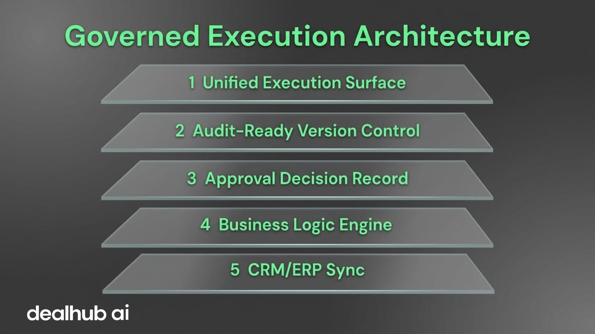 Governed execution architecture is built on five integrated layers, each serving a specific governance function. Together, they create a system where revenue logic lives in the workflow, not bolted on afterward.